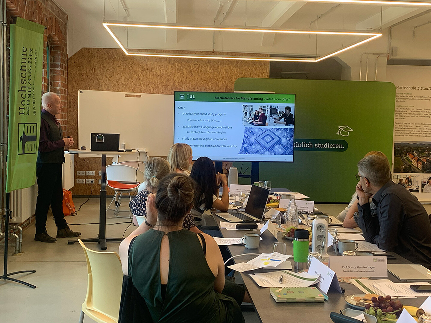 Im Mittelpunkt des Treffens stand die Frage, wie zukunftsorientierte Studienangebote an der HSZG aussehen müssen, um dem wachsenden Fachkräftebedarf der Halbleiterbranche gerecht zu werden. Gemeinsam mit Infineon diskutierten Vertreter:innen der Hochschule über die inhaltliche und strukturelle Ausgestaltung der geplanten Studiengänge Halbleiterprozesse und Materialchemie (B.Sc.) sowie Mechatronics for Manufacturing (B.Sc.), letzterer Studiengang wird in Kooperation mit der TU Liberec gestaltet. Ziel ist es, praxisnahe Curricula zu schaffen, die jungen Talenten fundierte Kompetenzen vermitteln und ihnen zugleich frühzeitige Praxiserfahrungen ermöglichen.
