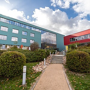 Ein Teil eines Hochschulgebäudes der Hochschule Zittau/Görlitz ist in Regenbogenfarben angestrahlt.
