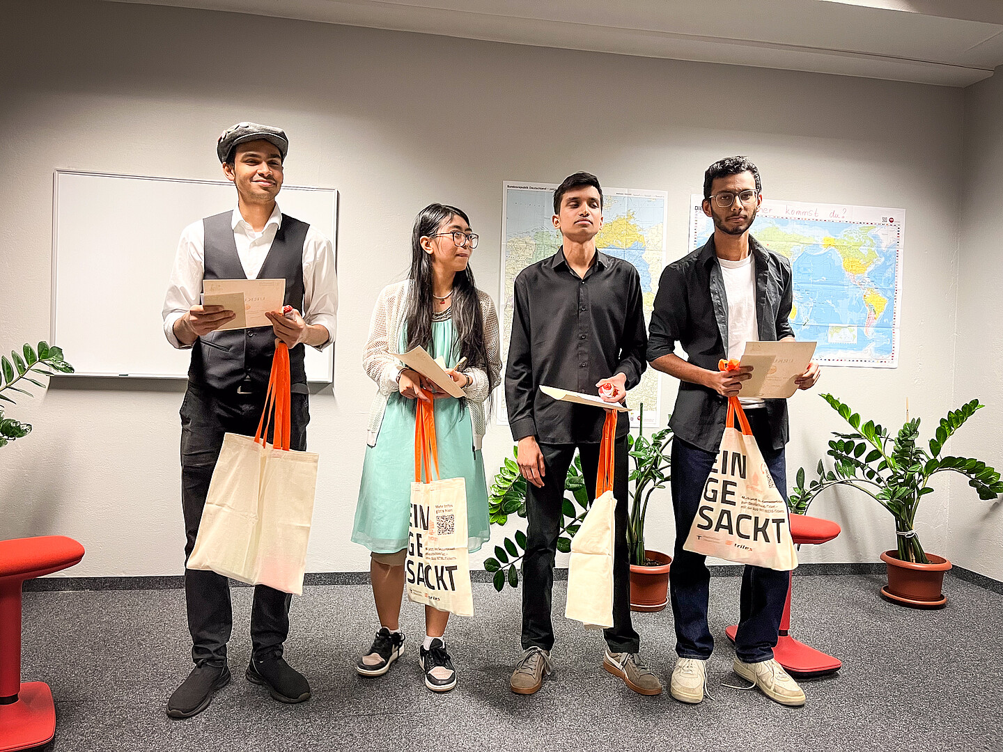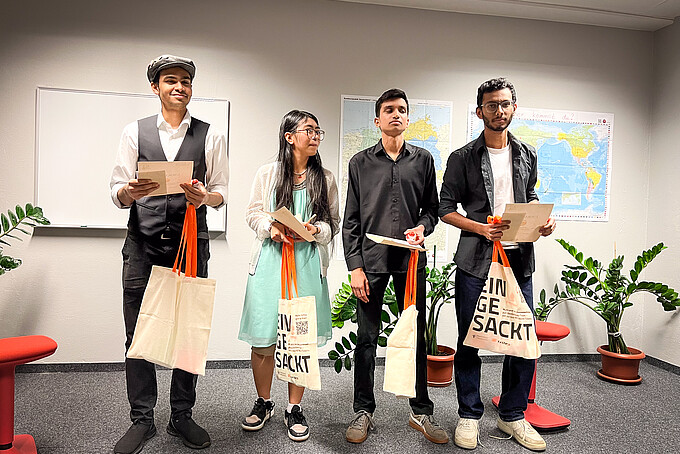 Die Jury, bestehend aus Ellen Leuschner, Marina Matthey, Erich Cella und Dr. Stefan Kühne, bewertete am Ende die Beiträge und kürte die Gewinner. Alle Jurymitglieder sind täglich intensiv mit den internationalen Studierenden beschäftigt - sie lehren und unterstützen sie sowohl beim Studium als auch im Leben in Deutschland.