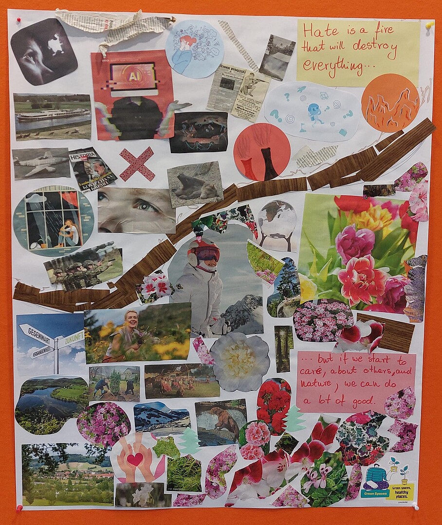 Um die bestehenden Berührungspunkte mit dem regionalen Strukturwandel festzuhalten und um über Interessen, Wünsche und Forderungen in einen ausführlicheren Austausch zu kommen, konnten die Teilnehmenden in einer Gruppenarbeit Collagen anfertigen. Es bildeten sich zwei Gruppen zu verschiedenen Themenschwerpunkten. Eine Gruppe erarbeitete eine Collage, in der sie ihre Ängste und Forderungen zur Zukunft der Region festhielten. Besonders prominent waren die Themen Umweltschutz und Vielfalt. Die andere Gruppe befasste sich in ihrer Collage mit dem Thema Jugendbeteiligung. Hierbei wurde die Forderung nach Aufenthaltsorten außerhalb der Schule und der Familie deutlich. Die Jugendlichen wünschen sich Orte um mit Gleichaltrigen in den Austausch zu kommen und sich kreativ entfalten zu können. Die Ergebnisse wurden stolz präsentiert und regten Gespräche an. Im Anschluss werden sie in der Hochschule ausgehangen.