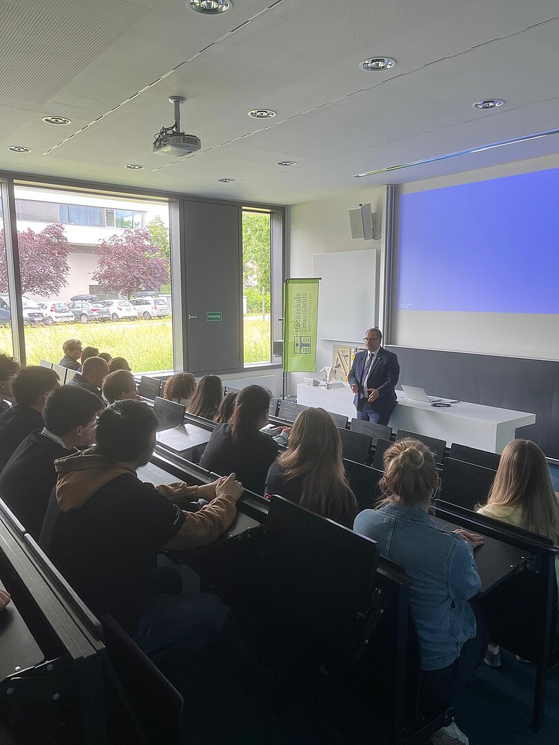 Am 16. und 17. Juni 2025 begrüßten wir zum zweiten Mal eine Gruppe von 21 Kollegiatinnen und Kollegiaten, begleitet von der Leiterin des Studienkollegs Rahn Education Leipzig sowie acht Lehrenden, auf unserem Campus in Zittau. „Ziel dieses Besuchs war es, unseren Campus, unsere vielfältigen Studienangebote und die freundliche Atmosphäre vor Ort kennenzulernen“, so der Rektor, Prof. Dr. Alexander Kratzsch.