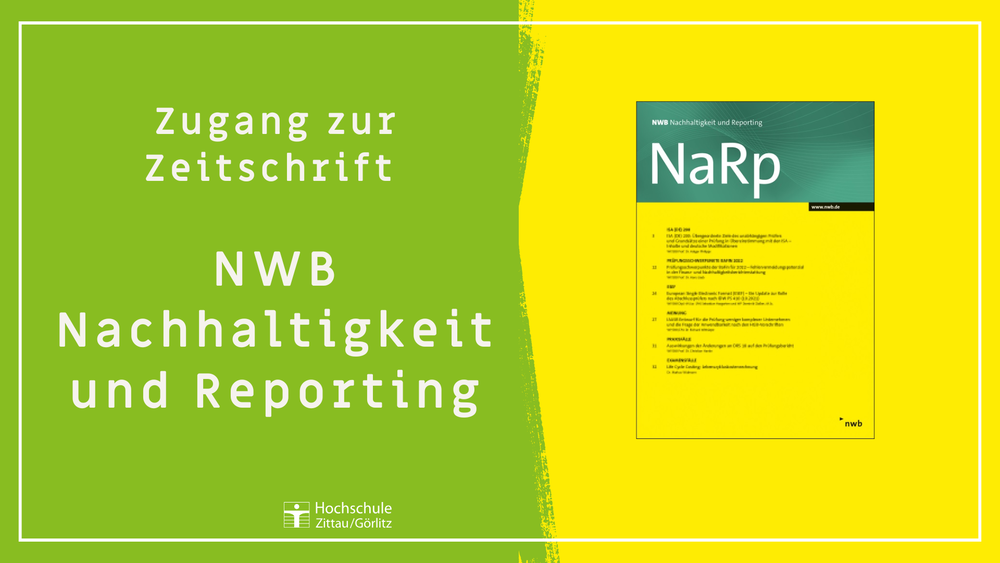 Die Hochschulbibliothek stellt ab sofort einen Zugang zur Zeitschrift NWB Nachhaltigkeit und Reporting bereit. Neben dem Volltextzugriff auf das E-Journal ab der ersten Ausgabe 2023, H. 1 werden über die nwb Datenbank aktuelle Berichte und Nachrichten zum Thema Nachhaltigkeitsberichterstattung, Arbeitshilfen (wie Berechnungsprogramme und Checklisten), Gesetze und Richtlinien, Verwaltungsanweisungen und Rechtsprechung bereitgestellt.