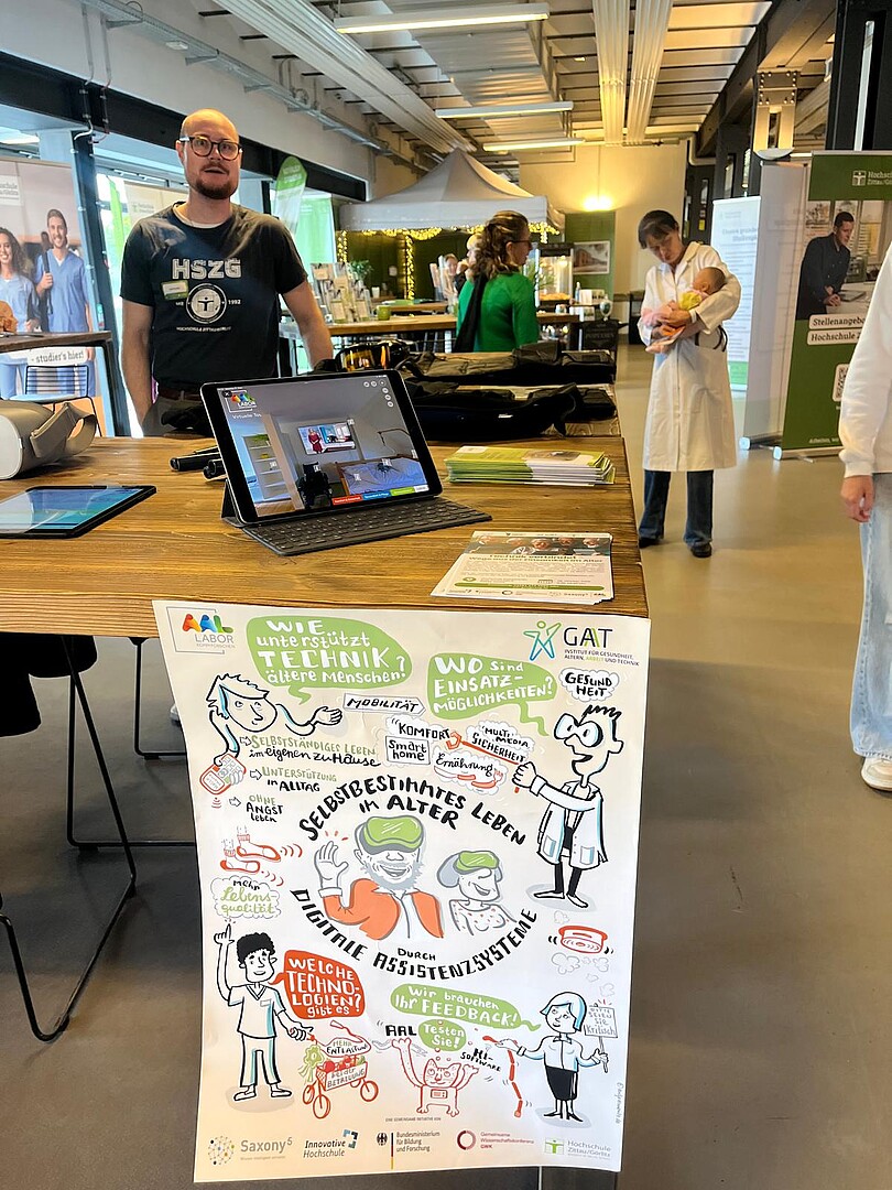 Das GAT-Institut sorgte für spannende Mitmach-Erlebnisse. Am Stand konnten Interessierte innovative Assistenztechnologien aus dem AAL-Labor( Link) selbst ausprobieren. Besonders gefragt war der Alterssimulationsanzug, mit dem sich am eigenen Körper erfahren lässt, wie sich altersbedingte Einschränkungen im Alltag bemerkbar machen.